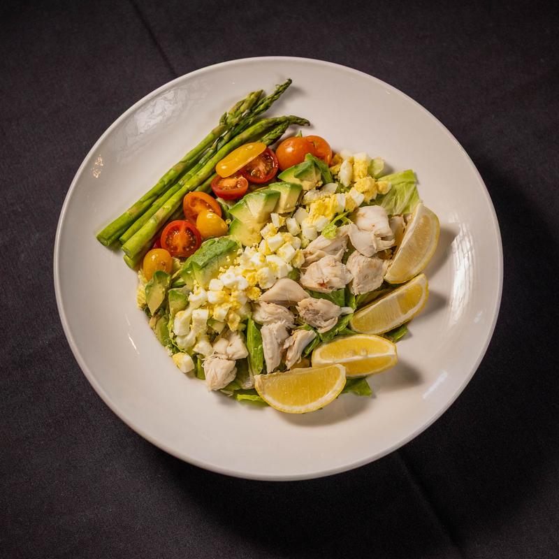 Romaine lettuce with jumbo lump crab, egg, poached asparagus, cherry tomatoes, avocado, and lemon wedges served with Louie dressing.