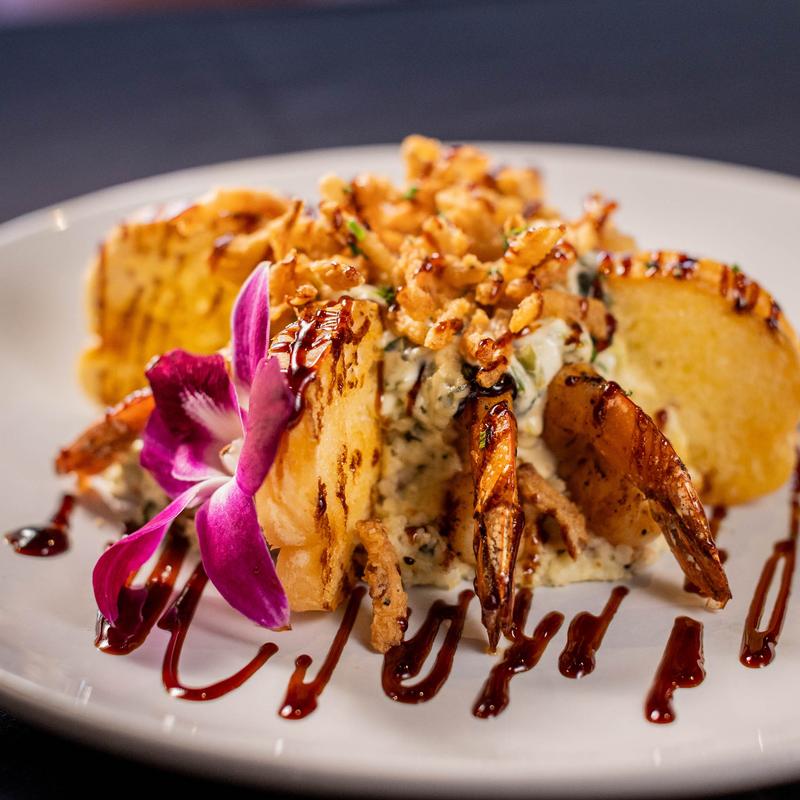 Creamy polenta infused with smoked Gouda and bacon bits. Topped with grilled shrimp, Tabasco-infused onions, balsamic glaze, and homemade parmesan wine sauce.