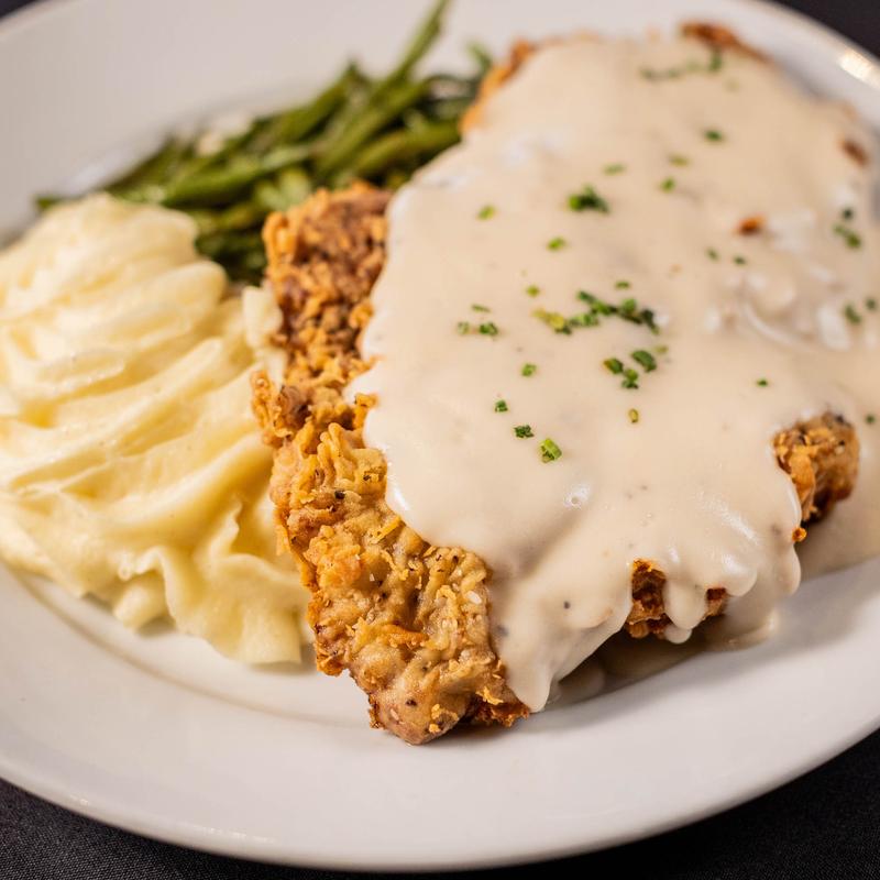 Our very own in-house tenderized 12-oz Ribeye steak. Served with whipped potatoes, green beans, and topped with gravy.