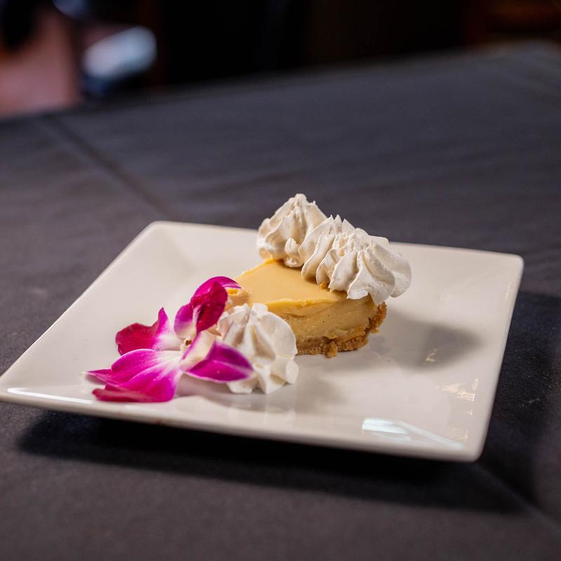 A slice of Our home-made key lime pie custard topped with whipped cream