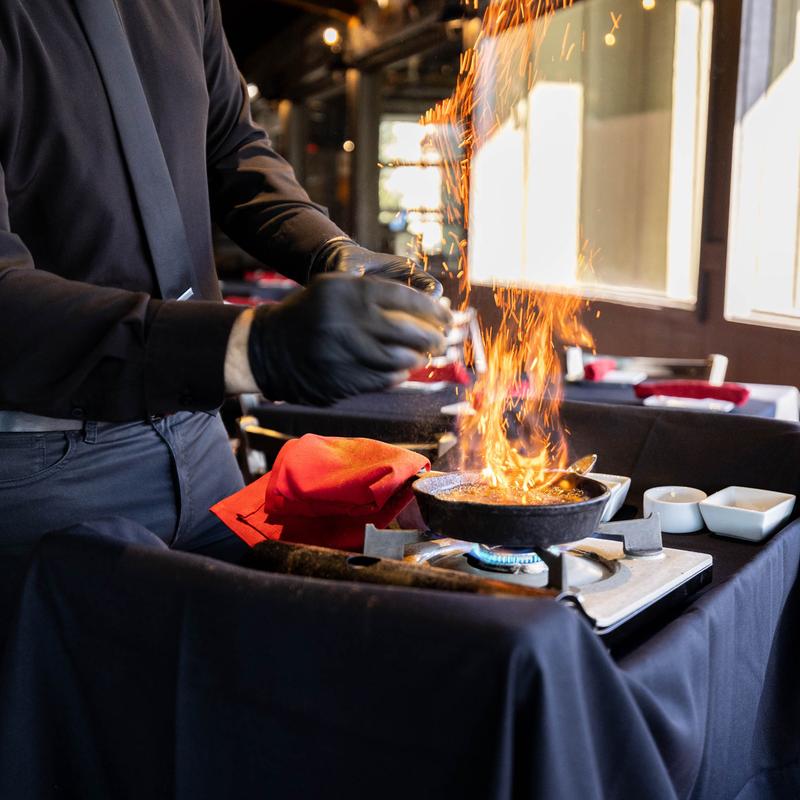 Prepared Table side. Fresh bananas in a classic caramel cinnamon French butter sauce. Served with organic Cinnamon ice cream.