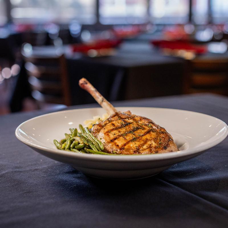 Grilled pork chop topped with a bourbon maple glaze. Served with whipped potatoes and green beans.